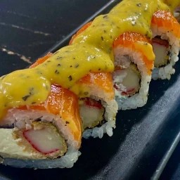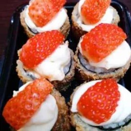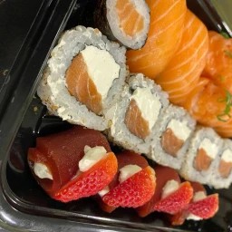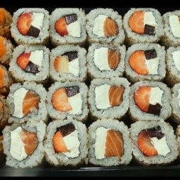 Prato principal + Sobremesa. Prato Principal: 5 Un Uramaki Filadélfia. 4 Un Hossomaki de Salmão. 2 Un Jhow de Salmão. Sobremesa: 4 Un de Ichigo.