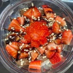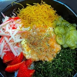 Salmão batido com cream cheese , kani desfiado, morango, sunomono, couve frita, crispy de batata e Shari (Arroz temperado)