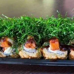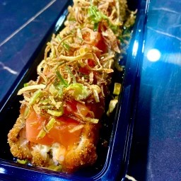 Salmão, cream cheese, molho tarê, camarão empanado e crispy de couve.