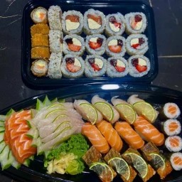 6 un sashimi de salmão 6 un sashimi de peixe branco 6 un sashimi atum 4 un niguiri de salmão 4 un niguiri de kani 4 un hossomaki de salmão 5 un uramaki Filadélfia 4 un Jow de cream cheese e maracujá 4 un Jow cream cheese e geleia de pimenta