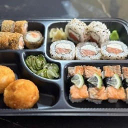 6 Fatias de Sashimi de Salmão. 5 Un Uramaki Filadélfia. 5 Un Hot Filadélfia. 4 Un Hossomaki de Salmão. 4 Un Niguiri de Salmão. 2 Un Jhow de Salmão.