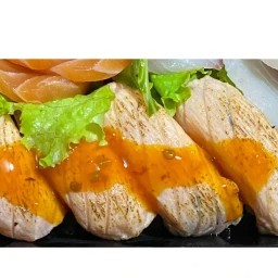 5 Fatias de Sashimi de Salmão Selado com Molho de Ostra. 5 Fatias de Sashimi de Salmão. 4 Un Jow de Salmão Selado sem Arroz com Geléia de Pimenta. 4 Un Niguiri de Salmão Selado com Geléia de Pimenta. 4 Un Niguiri de Salmão. 5 Un Uramaki Filadélfia. 10