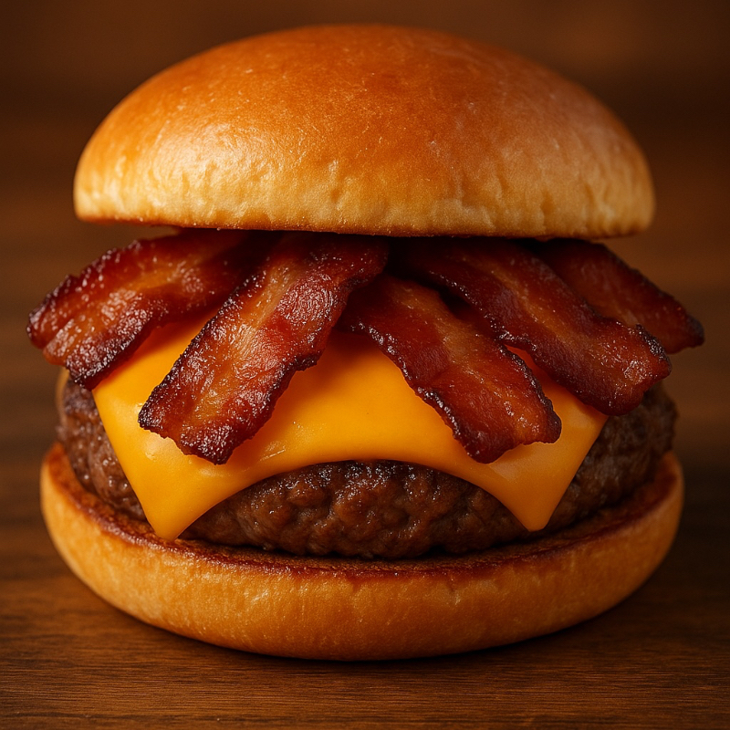 hambúrguer suculento, queijo cheddar derretido e tiras de bacon crocante que dão o toque defumado perfeito em cada mordida. Simples, intenso e irresistível — o clássico de rua no seu melhor estilo.