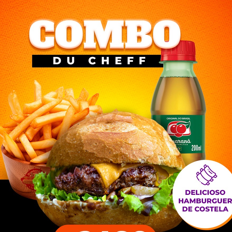 O combo famosinho da casa voltouu. Um hambúrguer (130gr) super suculento com aquela salada fresquinha( alface , tomate e picles ) molho barbecue e queijo cheddar e obvio que vai a maionese da casa ️ ahhh e você escolhe qual o pão que você quer junto desse Burguer delicioso a batata frita crocante e aquela refri acompanham