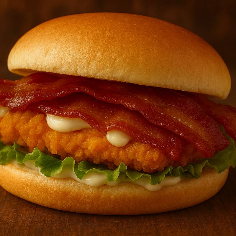Pão a sua escolha , tira de frango empanado crocante, bacon sequinho, queijo mussarela derretido e maionese cremosa. Intenso e irresistível.