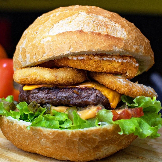 Pão, hambúrguer artesanal de costela 130g, onion rings, maionese artesanal, queijo cheddar fatiado, molho Billy & Jack, alface, tomate e picles.
