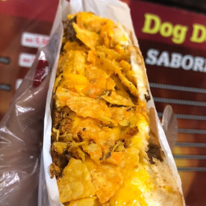 um delicioso hot dog com 1 vina , maionese da casa , carne moida levemente picante , muito cheddar e doritos. Uma deliciaaaa