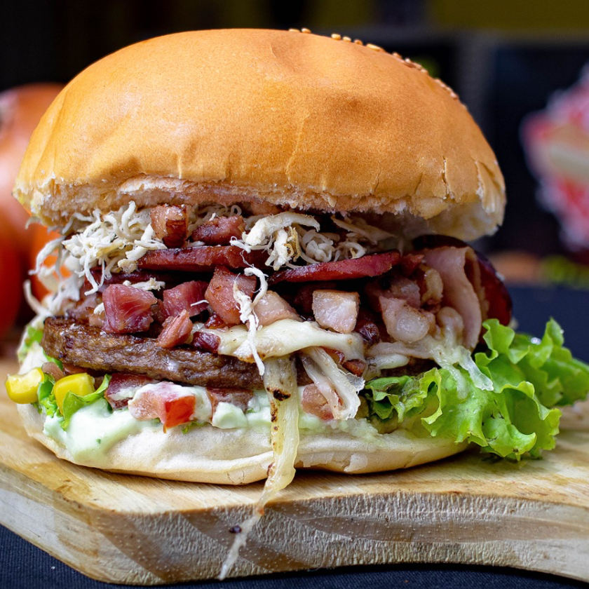 Pão, hambúrguer tradicional 50g, frango desfiado, maionese artesanal, queijo mussarela, presunto, alface, tomate, cebola e milho.
