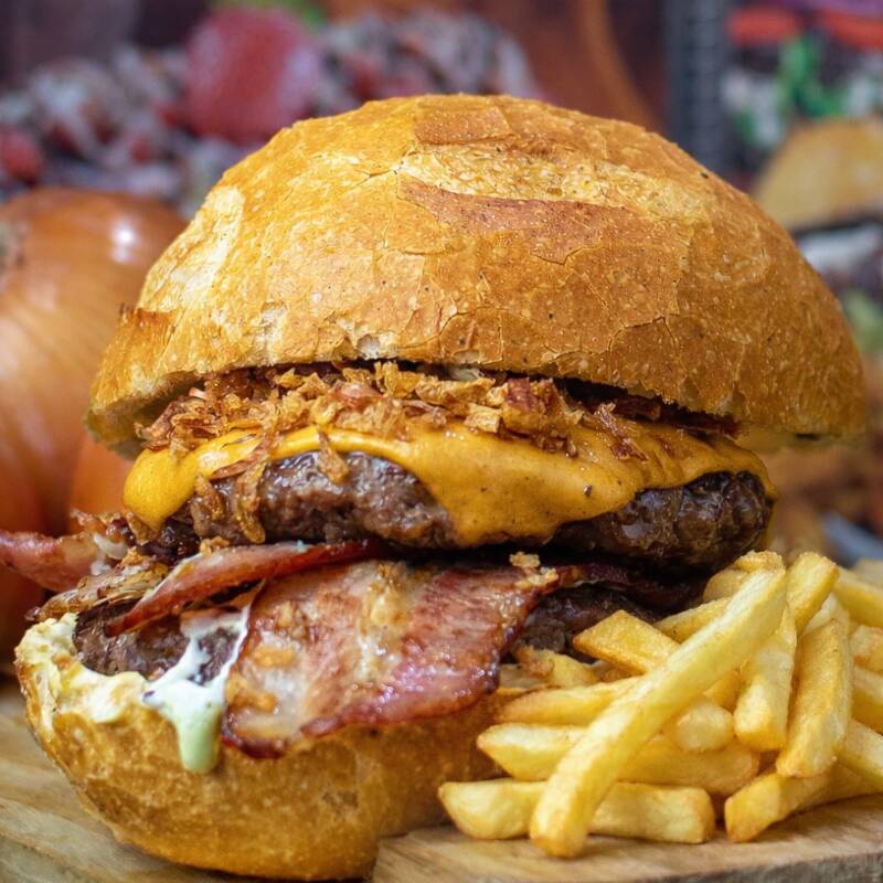 Hambúrguer duplo de costela, com bacon em fatias, 2 fatias de queijo cheddar, cebola crispy e maionese da casa, acompanhado de batata frita crocante. Um lanche robusto e cheio de sabor!