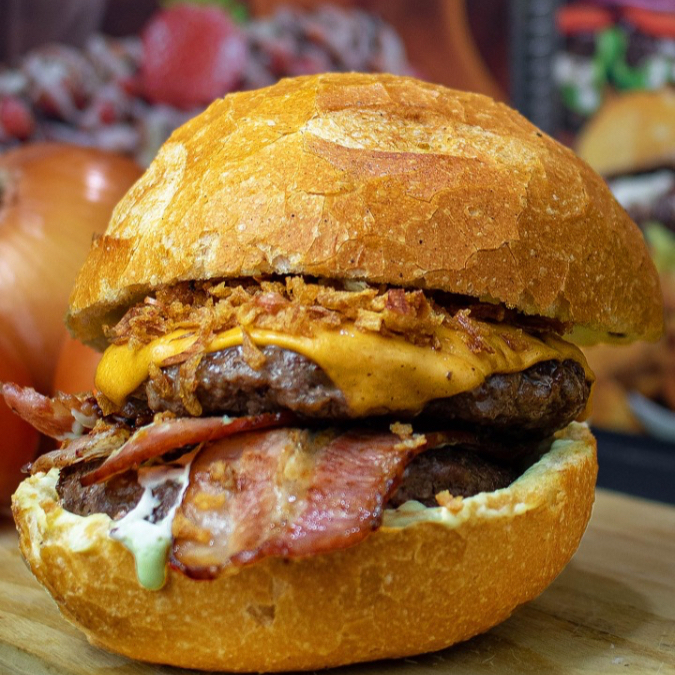 Pão, dois hambúrgueres artesanais de costela de 130g cada, bacon rústico canadense fatiado, cebola crispy, maionese artesanal e duas fatias de queijo cheddar.