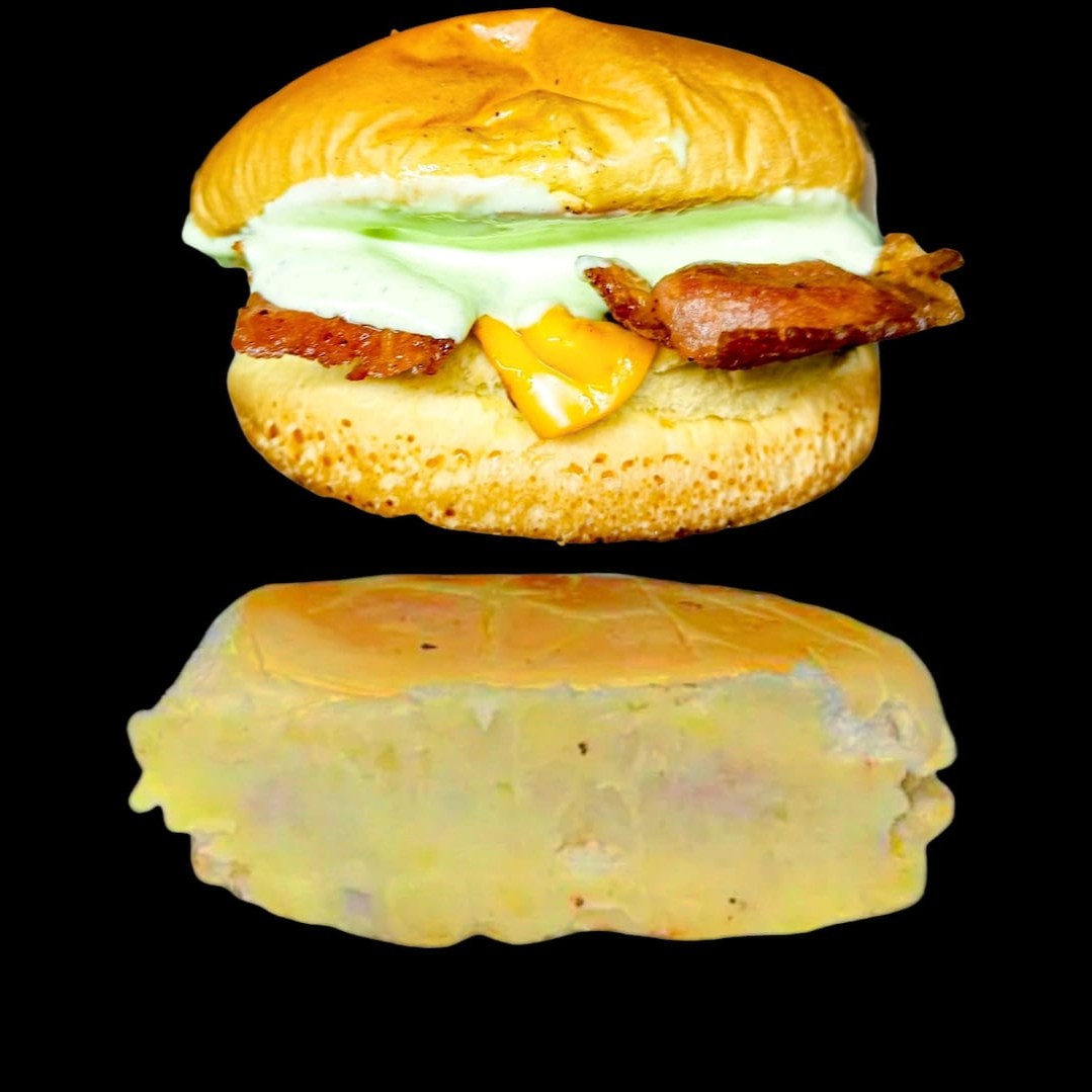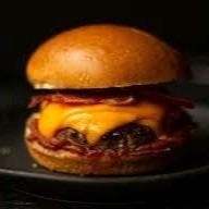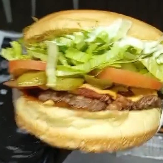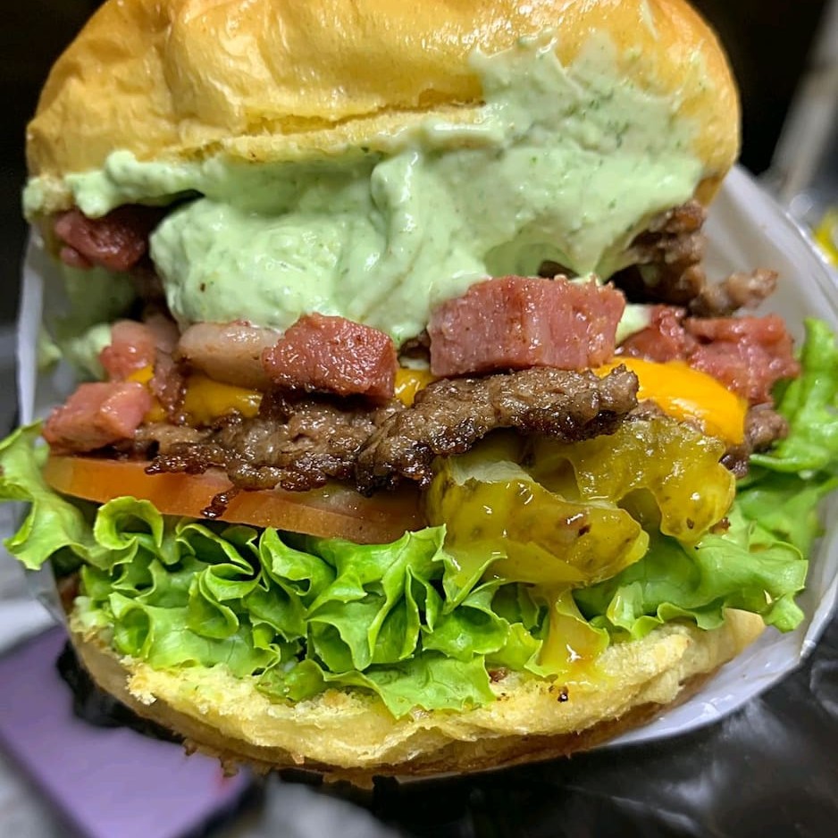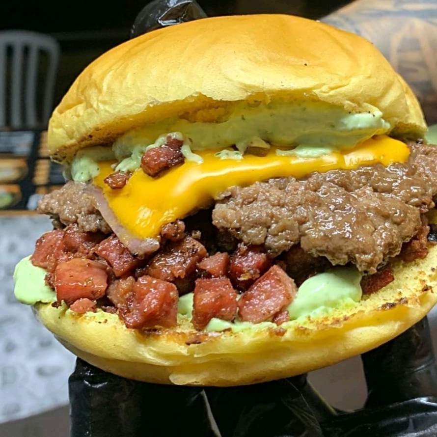 Irresistível hambúrguer artesanal feito de costela,pão selado na chapa , contendo frango , bacon em cubos como recheio , molho cheddar , maionese caseira e 3 hambúrguer smash ao ponto