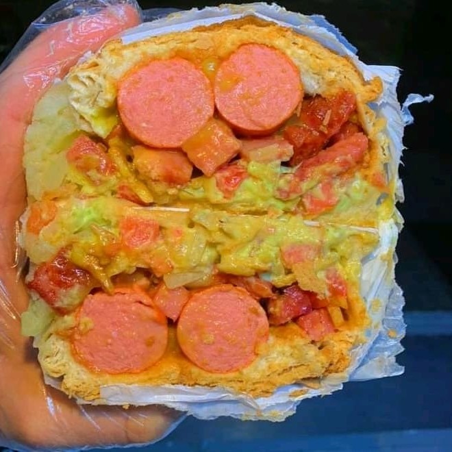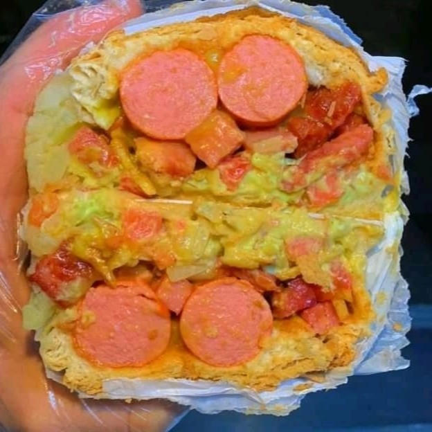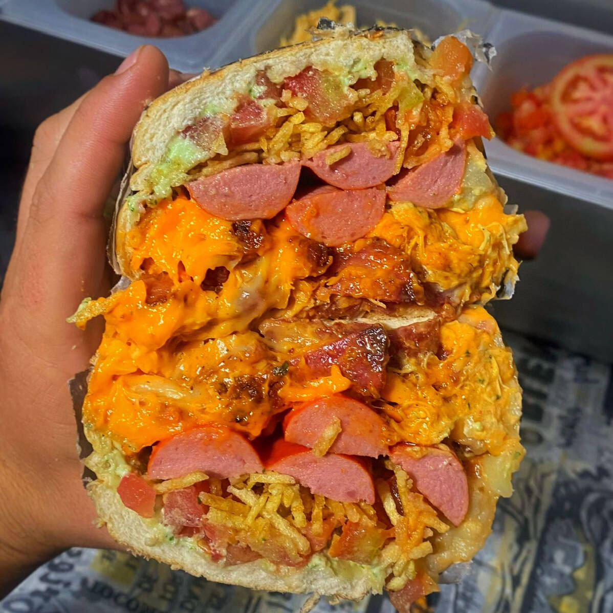 Pão crocante, Uma incrível Maionese verde caseira, milho, Tomate em cubos selecionados, cebola fresca em cubos, Batata Palha crocante, 2 salsichas suculentas, calabresa no ponto, bacon em cubos, frango desfiado cheddar e Catupiry, mostarda , catchup, para selar incrível purê de batata caseiro