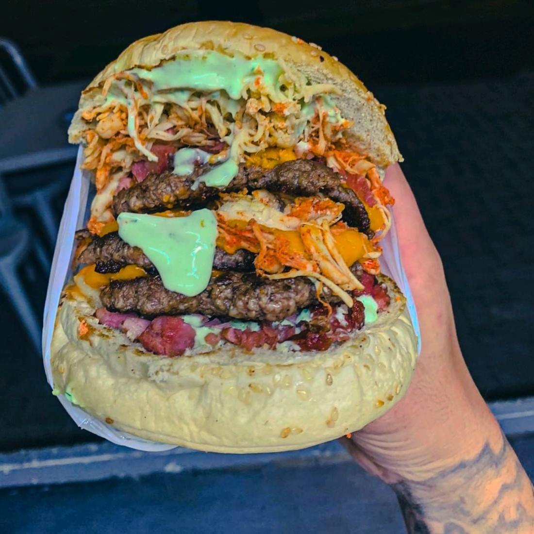 Pão de brioche selado na chapa, maionese molho verde caseira única, bacon em fatias crocante , 2 hambúrguer artesanal Smash no ponto, com 2 fatias de queijo cheddar derretido