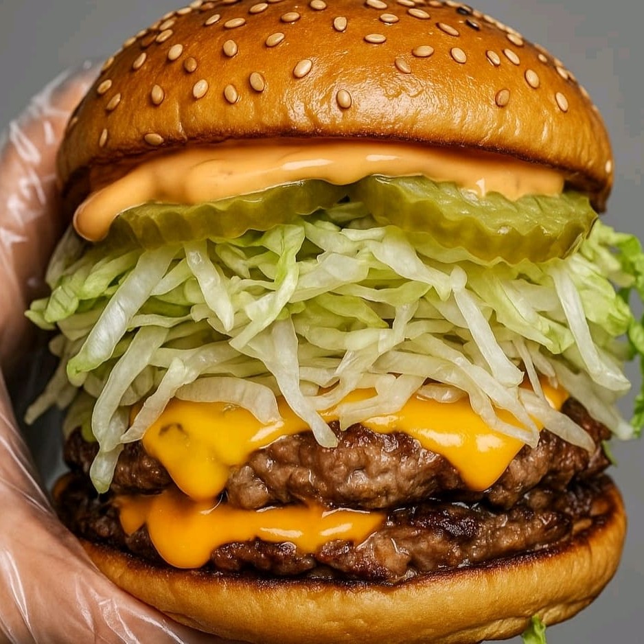 Pão com gergelim, molho americano, alface americana , picles , 2 hambúrguer costela, molho cheddar
