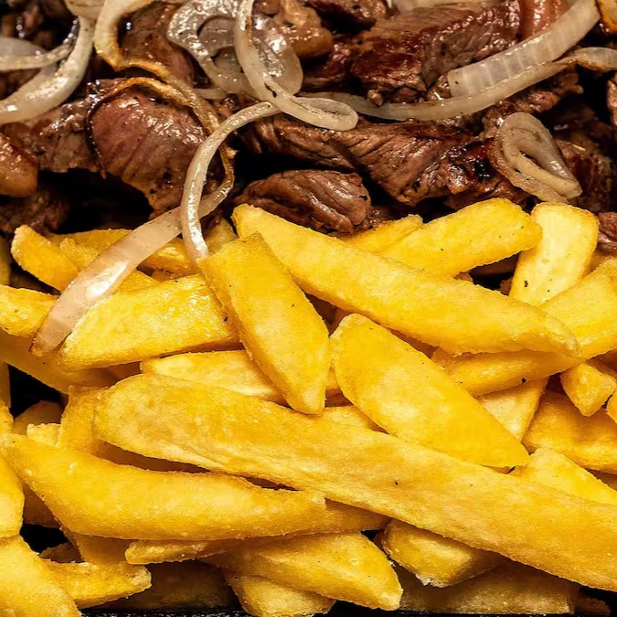 Alcatra 400g feito na chapa com cebolas mais batata fritas 500g