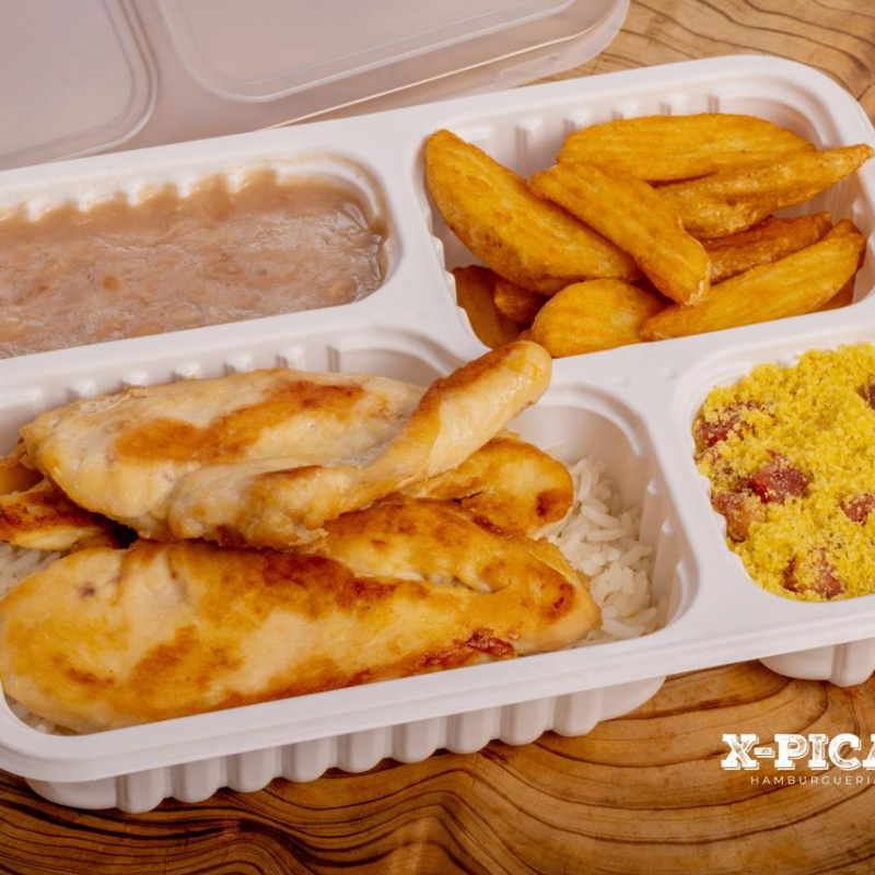 Desfrute de nossa Marmita de Frango', uma refeição completa que transborda sabor e sofisticação. Com arroz soltinho, feijão cozido à perfeição, batatas fritas douradas e crocantes, farofa saborosa e um filé de frango grelhado suculento, este prato é uma opção maravilhosa para uma refeição rápida e satisfatória. Este é mais do que um simples lanche, é uma experiência gastronômica que eleva os pratos executivos a um novo patamar de excelência. Perfeito para os amantes de comida de verdade, repleto de sabor e qualidade. Não deixe de experimentar!