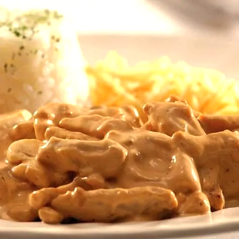 Arroz, feijao, farofa, strogonoff de frango e batata palha