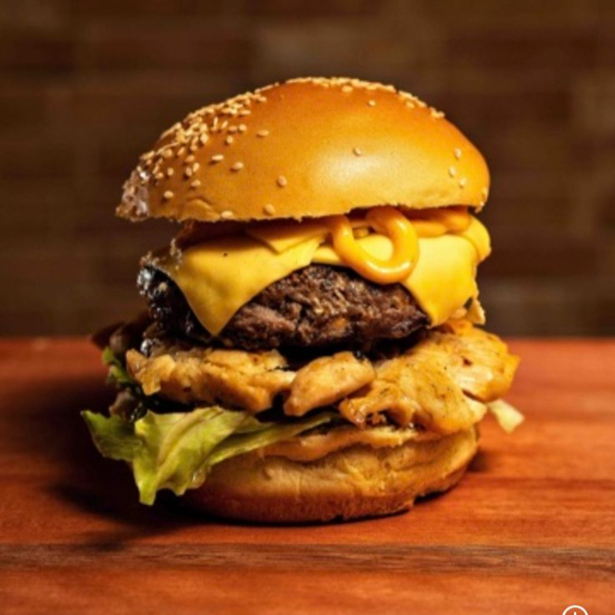 Pao de brioche, maionese, hamburger artesanal de 100g, frango grelhado, queijo, alface e tomate