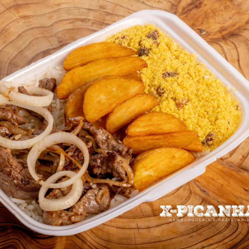Arroz, feijao, fritas, farofa , picanha premium grelhada acebolada