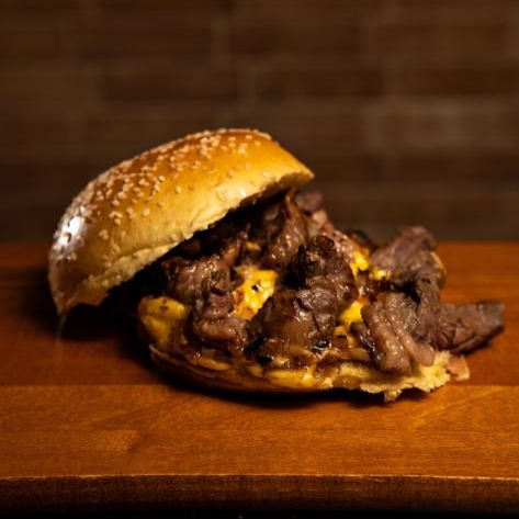 Pao de brioche, maionese, alcatra em tiras acebolada e queijo