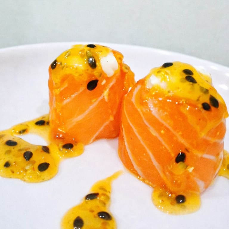 Enrolado no salmão, com arroz, cream cheese e molho de maracuja do chefe. Combinação perfeita!