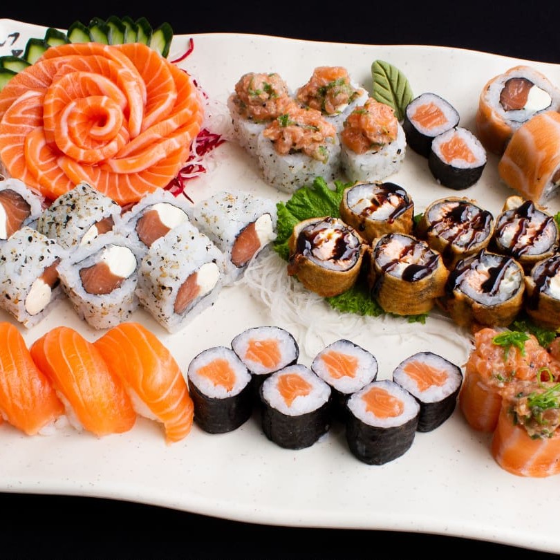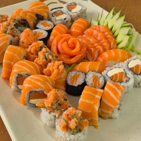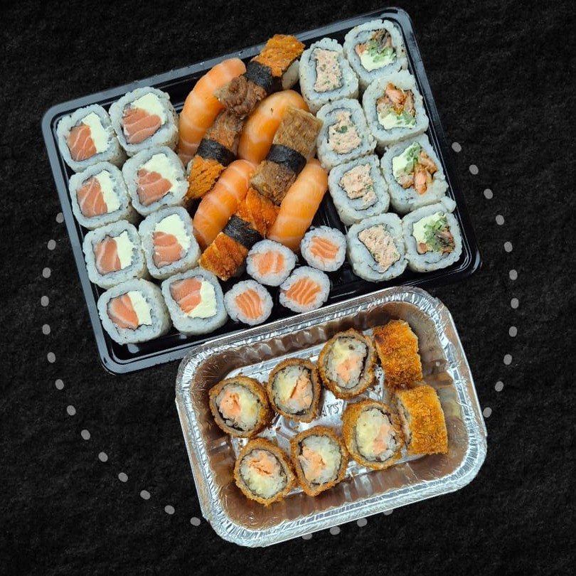 35 unidades - 4 fatias de salmão, 4 fatias de atum, 6 nigiris mistos, 4 salmão filadélfia, 4 nirumaki, 4 tekka, 4 shake e 5 futomaki