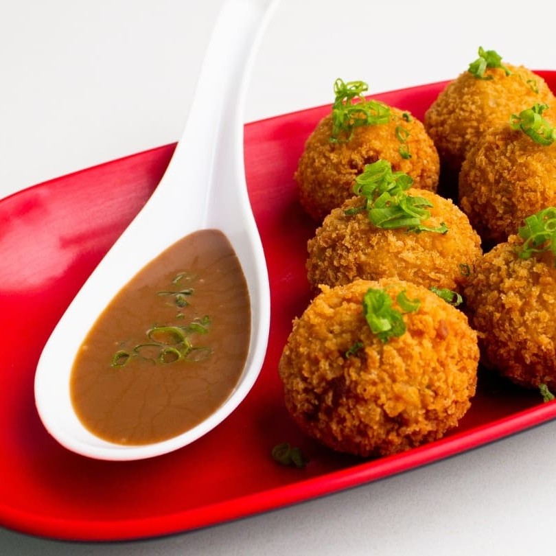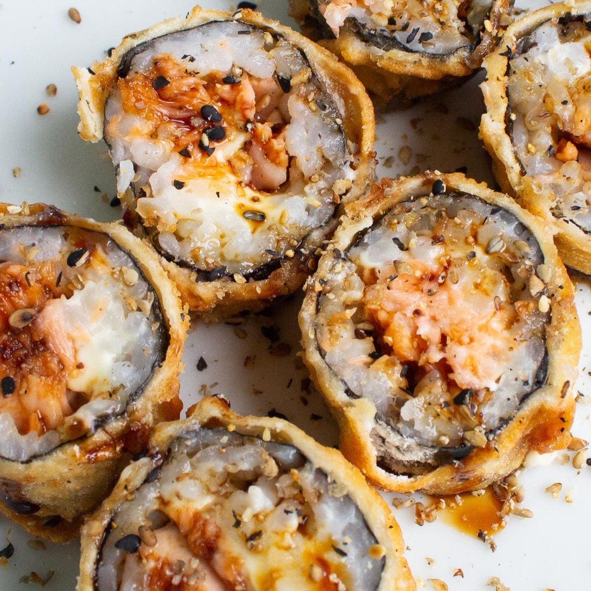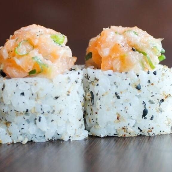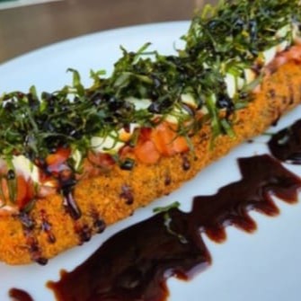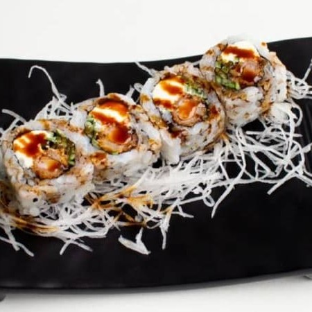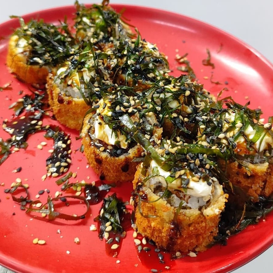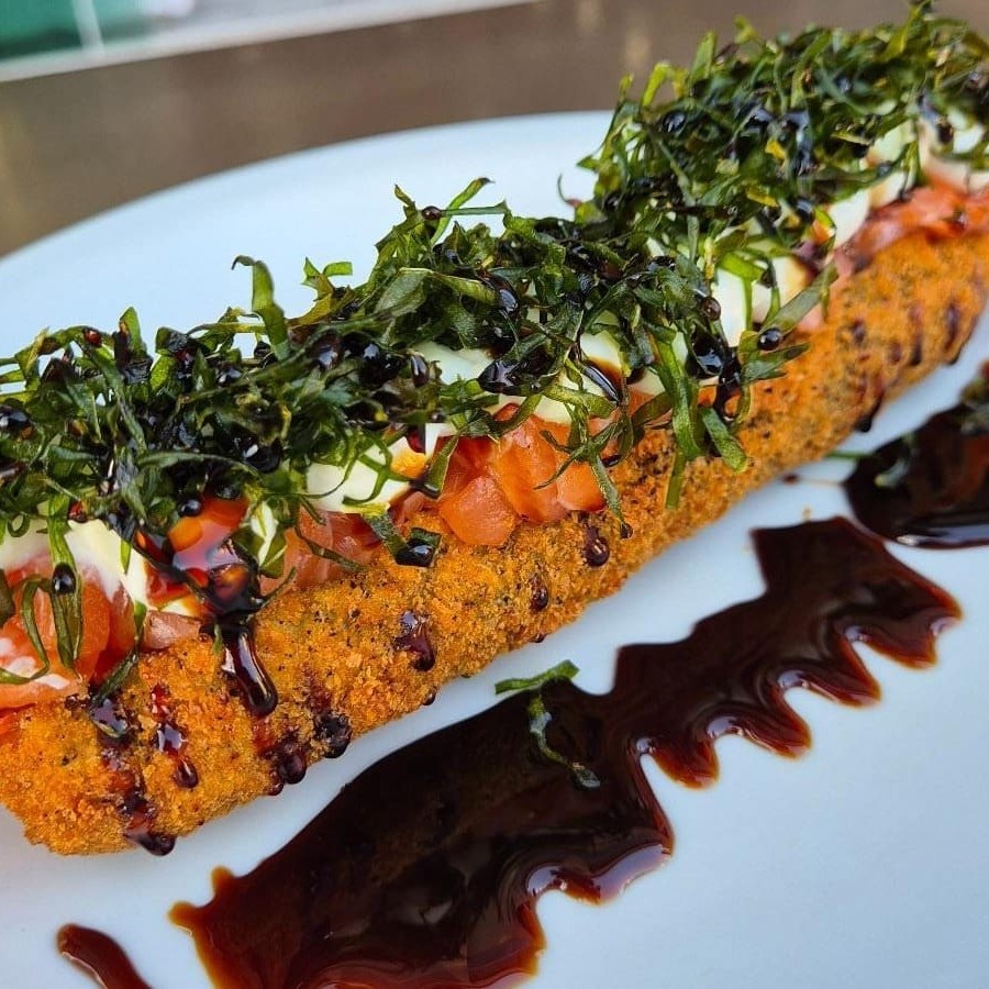 Sushi frito inteiro, recheado com salmão, cream cheese e couve crispy finalizado com molho tarê. Individual.