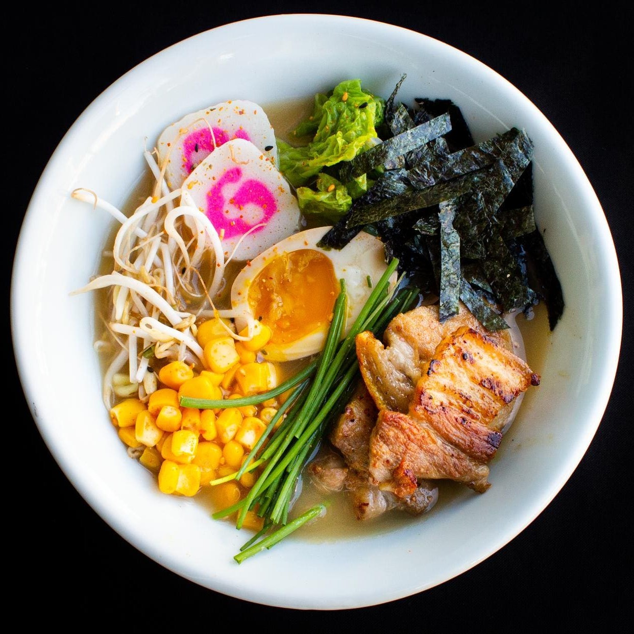 Nosso lámen é a base de caldo de peixe com missô. Uma massa fina, 100g de porco apimentado, milho verde, cebolinha, alga nori, moyashi, acelga, kamaboco e ovo à mollet. Porção individual, em torno de 400g.
