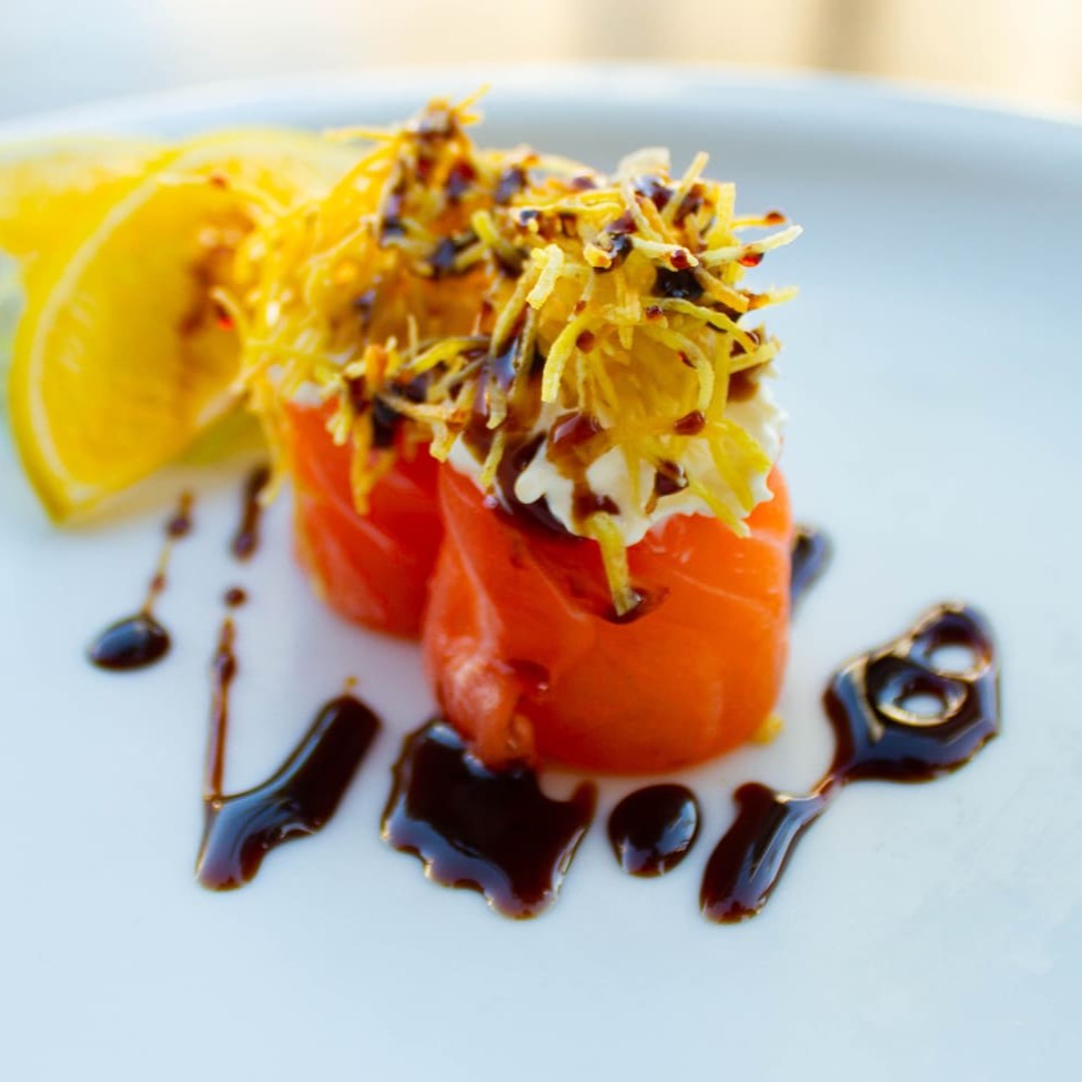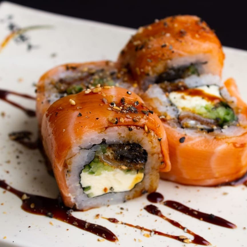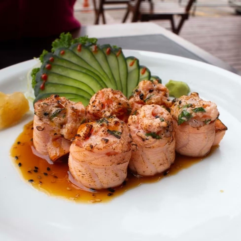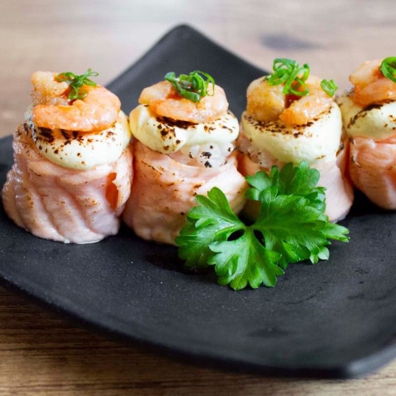 Enrolado no salmão maçaricado, arroz, cream cheese, camarão feito na manteiga a alho finalizado com cebolinha. Sugestão de molho: Geléia de pimenta.