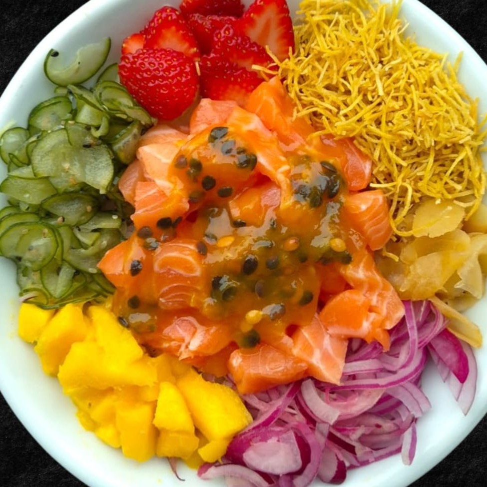 100g de proteína, crispy de batata doce, cebola roxa, gengibre, sunomono, morango e manga.