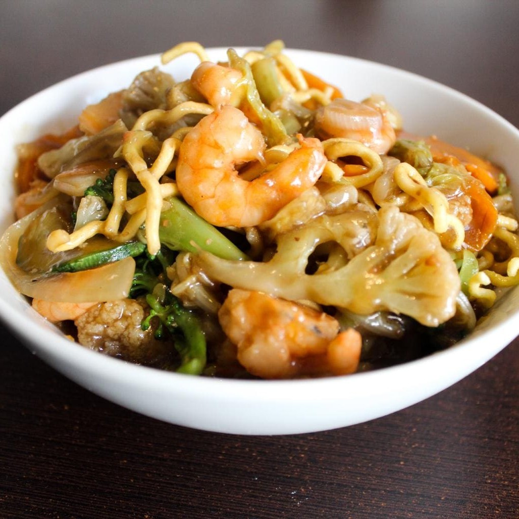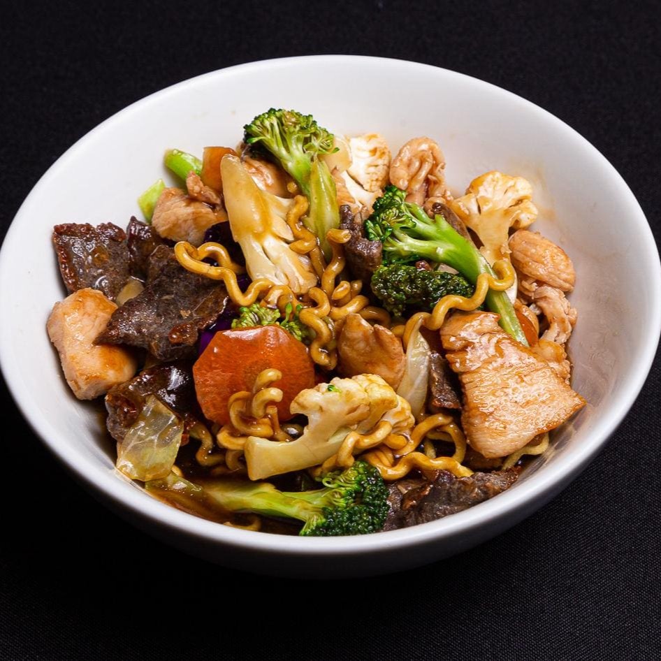Yakisoba tradicional com Macarrão Frito, legumes mistos(couve-flor, brocolis, abobrinha, cenoura, repolho, cebola, acelga) ao molho da casa e proteína a sua escolha! (Mignon e Camarão).