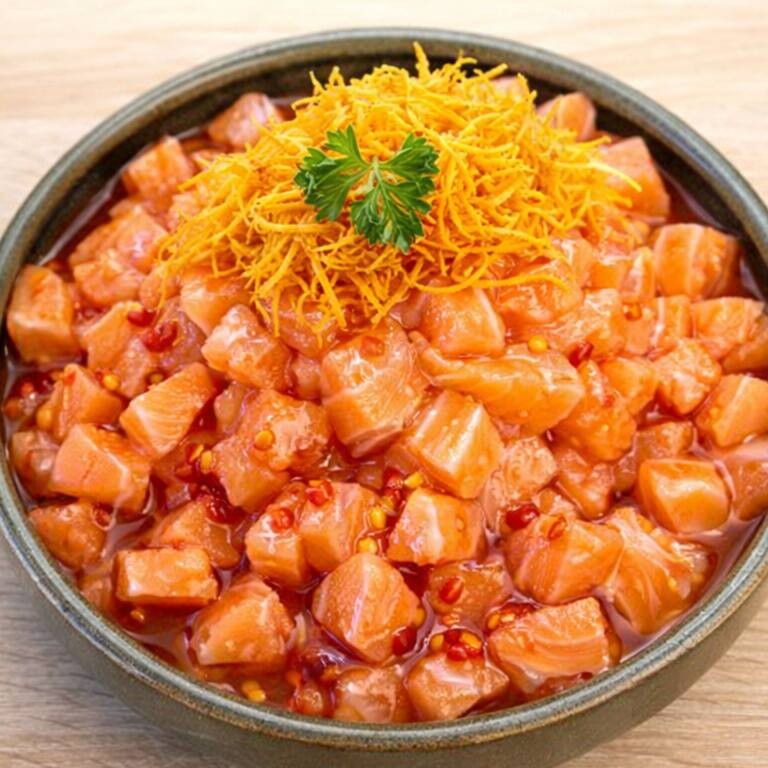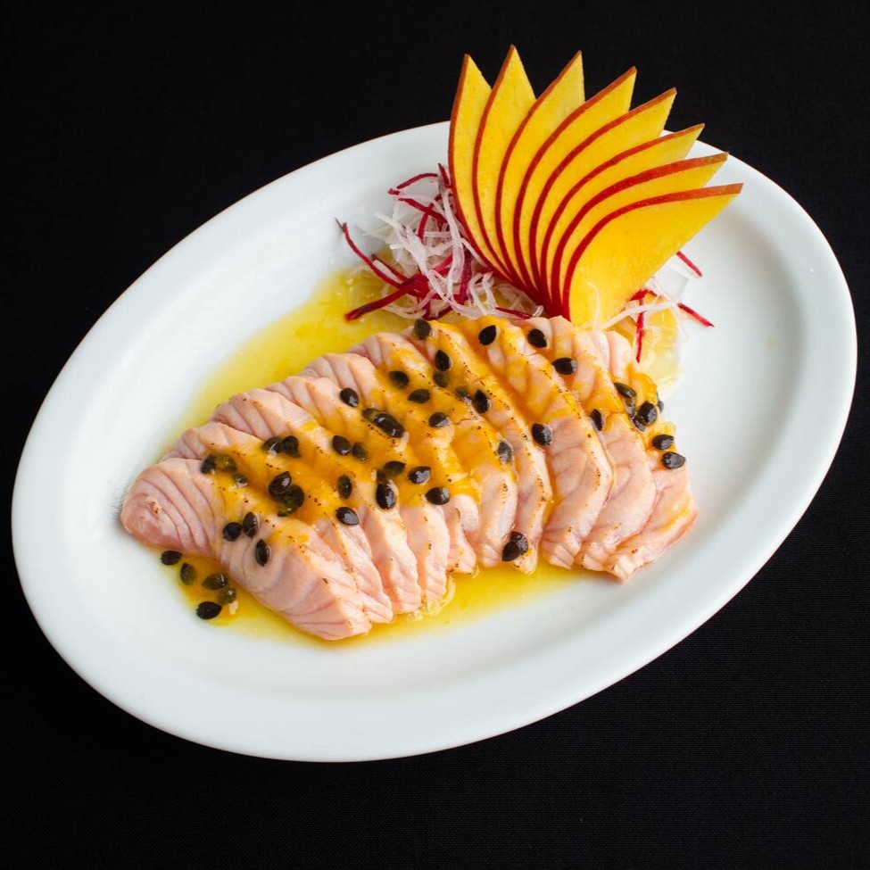 200g. Uma exclusividade Haná - Ceviche de salmão marinado no shoyu - combinado com sabor cítrico de limão e laranja, temperos selecionados e o toque suave da pimenta dedo-de-moça.