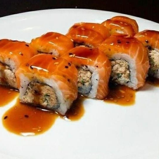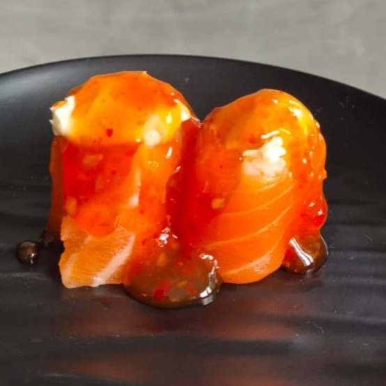 Enrolado no salmão, shari, cream cheese e finalizado com geléia de pimenta artesanal.