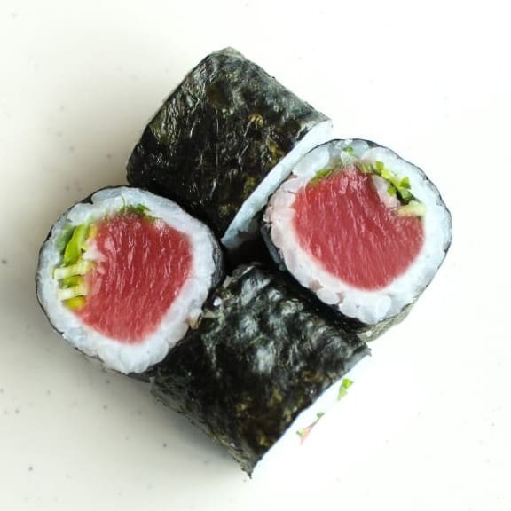 Sushi fino, com alga por fora recheado com atum.