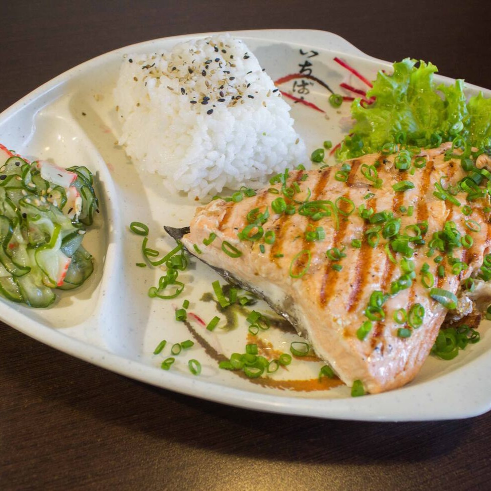 200g de salmão grelhado, 200g de gohan e 150g de sunomono. Obento mais completo!