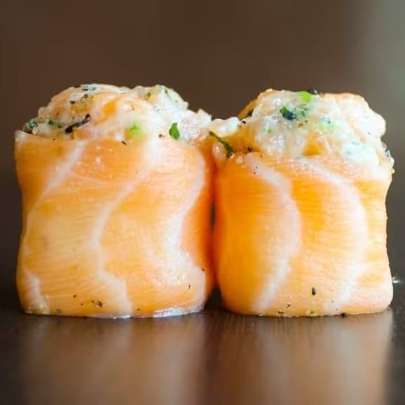 Recheado com arroz, enrolado no salmão com patê joe em cima (salmão batido com maionese e cebolinha), todo maçaricado. Acompanha molho de ostras.