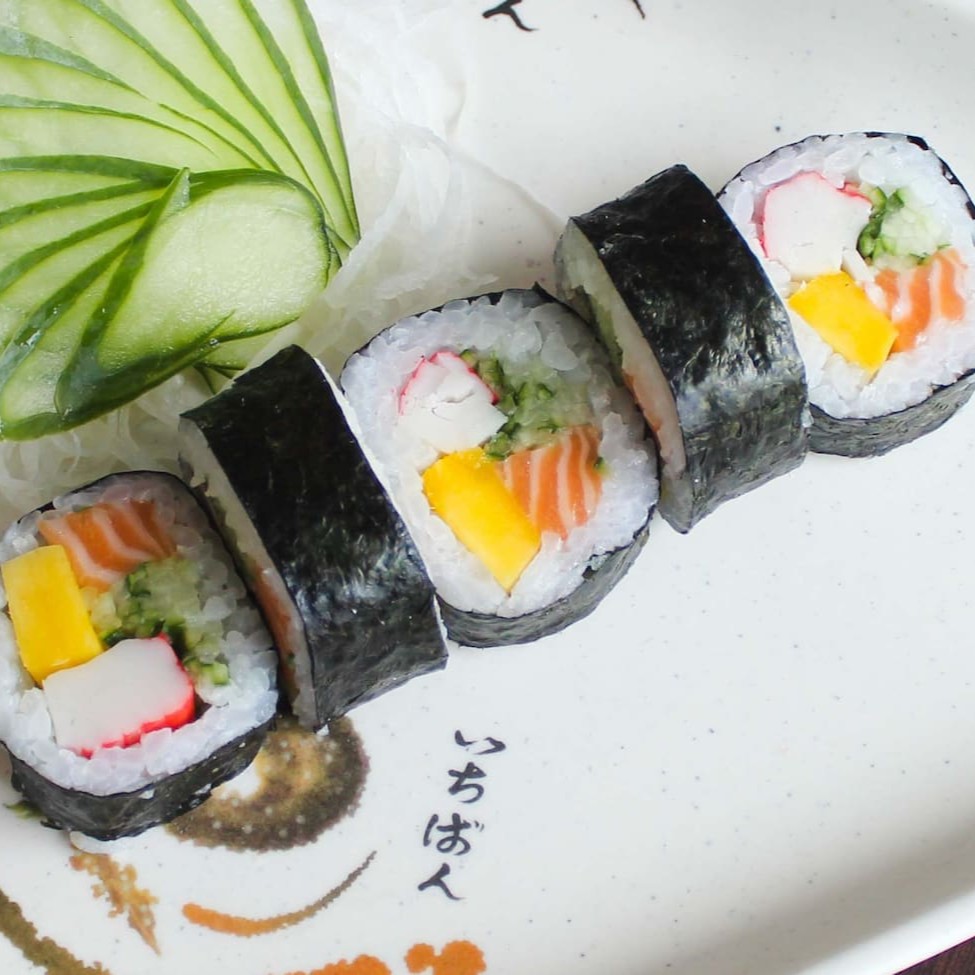 Sushi maior feito com a alga inteira, recheado com salmão, cream cheese, kani, manga e pepino.