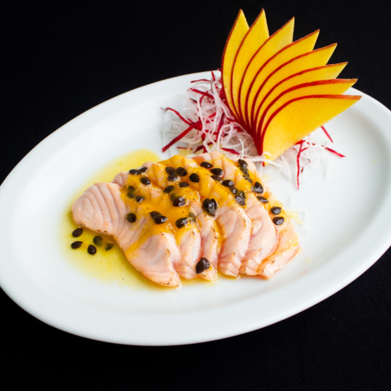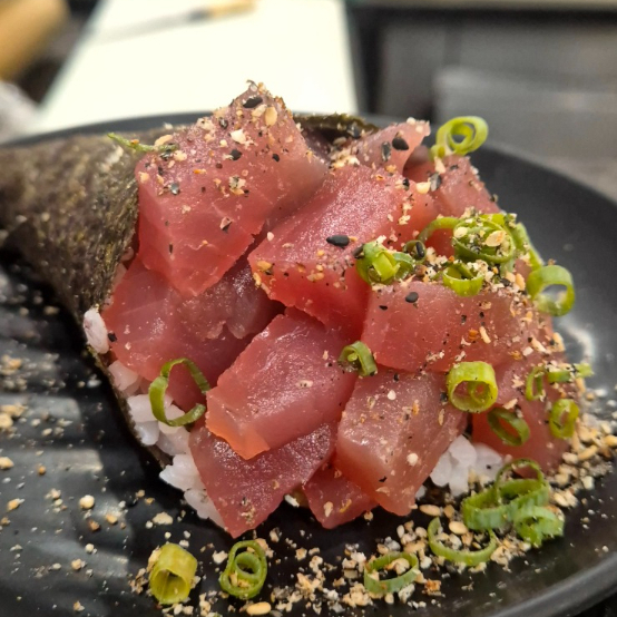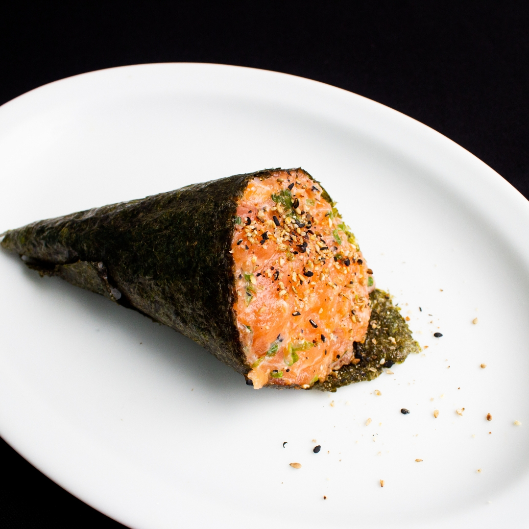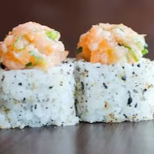 2 unidades - Enrolado no salmão, arroz, salmão batido com maionese e cebolinha. Maçaricado, finalizado com molho de ostras.