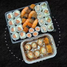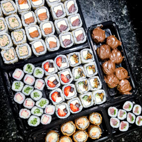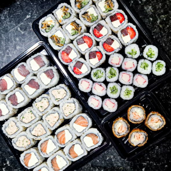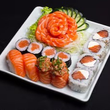 8 Salmão Filadélfia, 8 Atum Filadélfia, 8 Patê de salmão, 8 Salmão skin, 8 Romeu e Julieta, 8 Hossomaki pepino, 8 Hossomaki de Kani e 4 Hot Filadélfia.