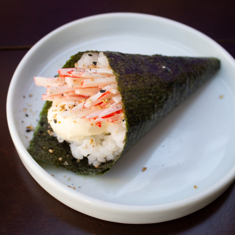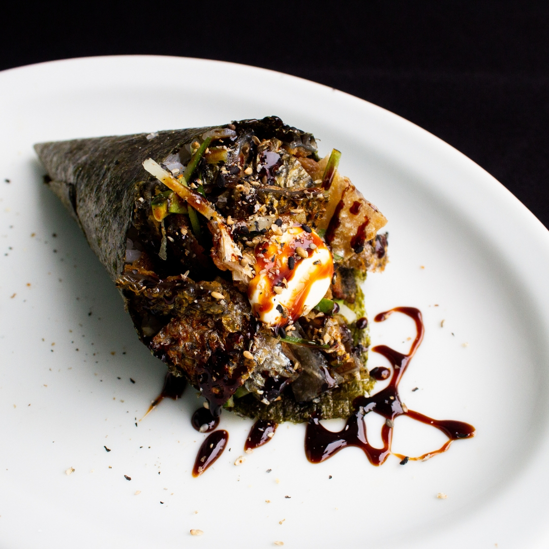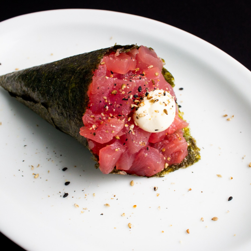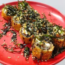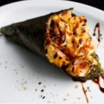 2 unidades - Enrolado no salmão, arroz, cream cheese, crispy de couve. Finalizado com molho tarê.