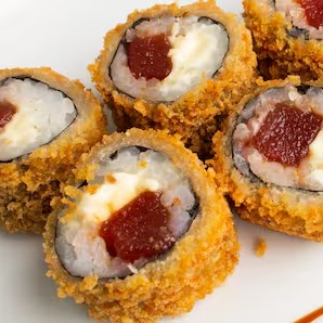 Salmão cru, camarão empanado, cream cheese e cebolinha. Acompanha molho de ostras.