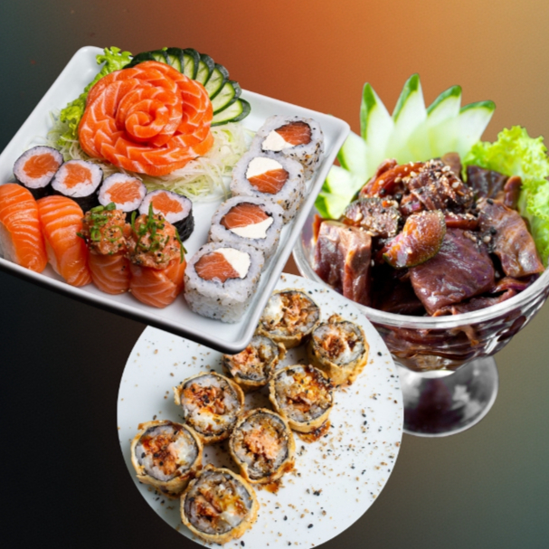 Entradas: Ceviche misto, sunomono de batata e ceviche salmão black. Combinado 48 peças: 12 sashimis (6 Fatias de salmão maçaricado e 6 Fatias de tilápia com limão intercalado), 4uni salmão filadélfia, 4uni sushi joe, 4uni skin especial, 4uni patê de salmão, 8uni nigiris mistos, 4 hossomaki de salmão, 4 hossomaki de pepino com geléia de pimenta e 4 Romeu e julieta. Quentes: 4 Bolinho de salmão, 4 hot filadélfia, 4 guioza frito e 4 Harumaki de camarão + 1 Porção de shimeji com legumes na manteiga (400g) - acompanha gohan. Sobremesa: 4 Unidades de harumaki de chocolate cremoso acompanha morangos. Acompanha wasabi, gengibre, hashi e shoyu. - Recomendado para 4 pessoas.
