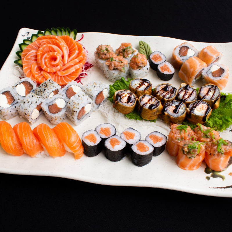 12 Fatias de salmão, 8 Uramaki salmão filadélfia, 4 Uramaki filadélfia especial, 4 Nigiris de salmão, 4 Sushi joe, 4 Uramaki joe, 8 Hossomaki de salmão e 8 Hot filadélfia