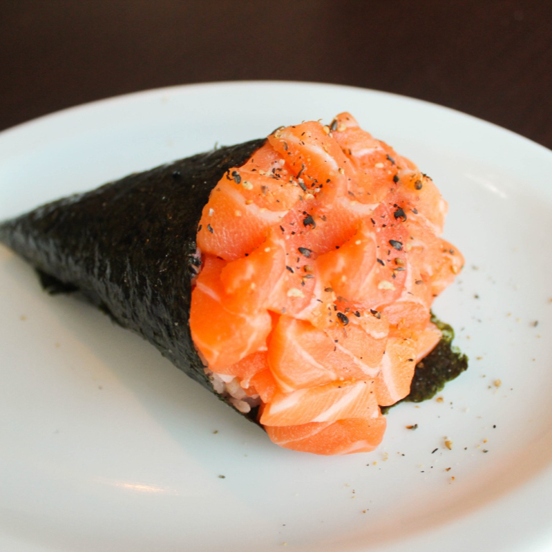 2 unidades - Enrolado no salmão, arroz, salmão batido com maionese e cebolinha.