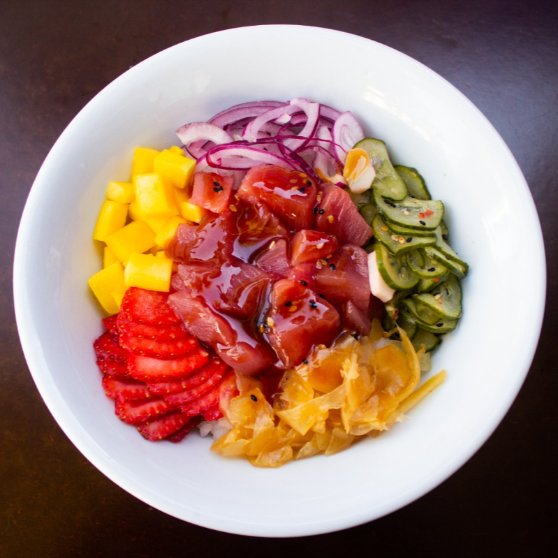 400g - Shari "arroz avinagrado de sushi" com gergelim e cebolinha. 100g de proteína, crispy de batata doce, cebola roxa, gengibre, sunomono, morango e manga. Finalizado com molho de maracuja - especial da casa - molho enviado a parte.