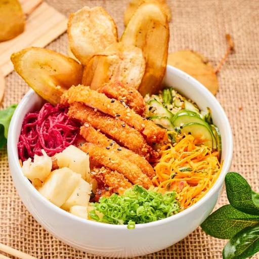 Filé suíno empanado e crocante, com o frescor do sunomono de pepino japonês e o sabor doce do abacaxi. Finalizado com chips de banana da terra e espaguete de legumes, esse poke vai te surpreender!