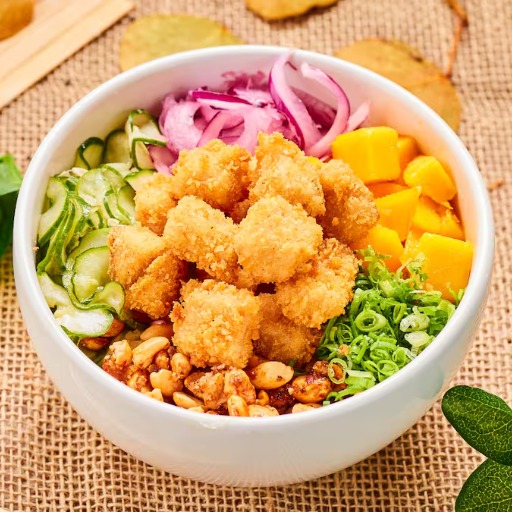 Frango empanado e crocante, servido sobre uma base de shari (arroz de sushi), acompanhado de sunomono de pepino japonês, manga suculenta, cebola roxa, cebolinha fresca e um toque especial de amendoim doce para equilibrar os sabores com uma crocância irresistível.