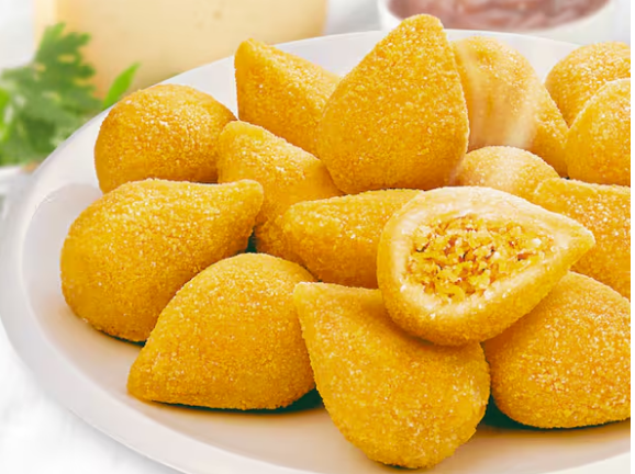 Porção de mini coxinha de 25gr a unidade fritas na hora.