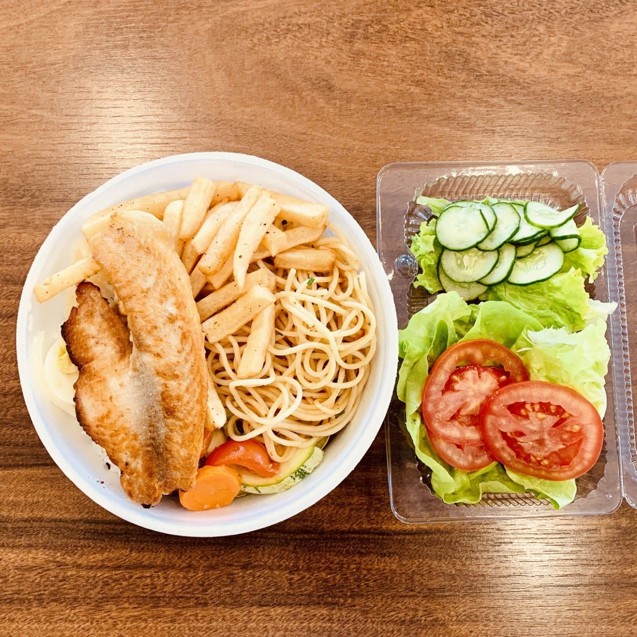 Arroz branco ou integral, feijão preto, legumes grelhados, spaghetti sugo, filé de tilápia grelhado ou milanesa, farofinha da casa, batata frita e salada.