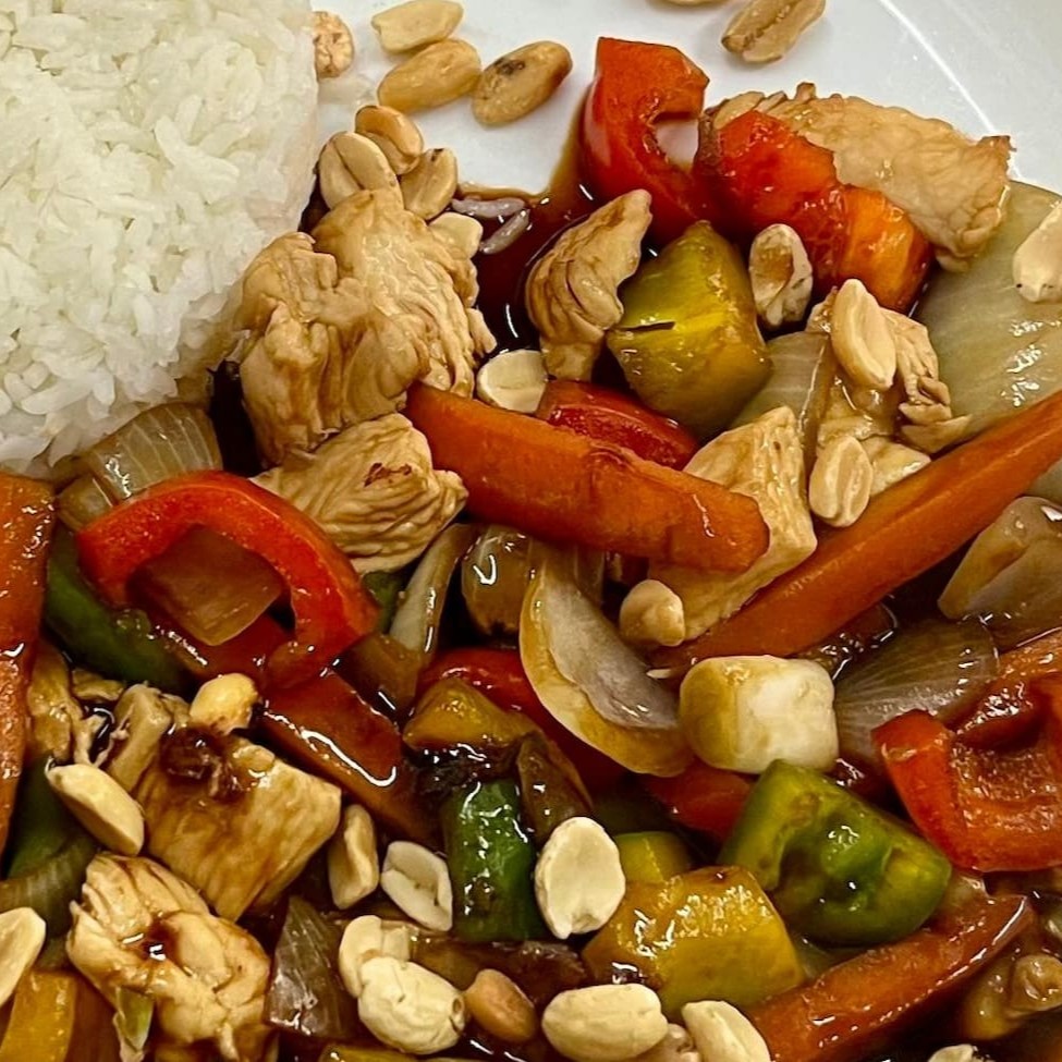Deliciosa porção do nosso Frango Xadrez. Acompanha Arroz Branco ou Integral, Frango Xadrez e um Mix de Salada Adicional. 450g aproximadamente.